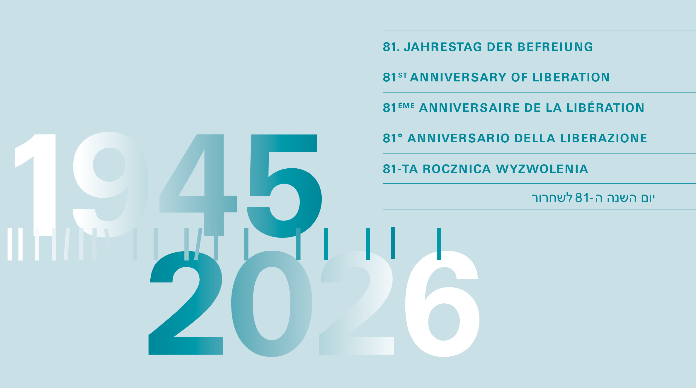 Der Schriftzug "Jahrestag der Befreiung des KZ Dachau" steht in weißer Schriftuntereinander in englischer, französischer, italienischer, polnischer, russischer und hebräischer Übersetzung. Der Hintergrund ist petrolfarben.